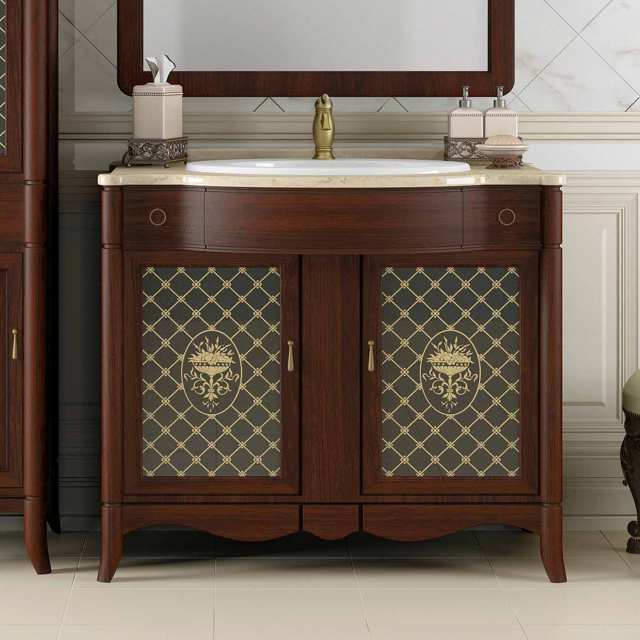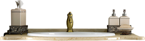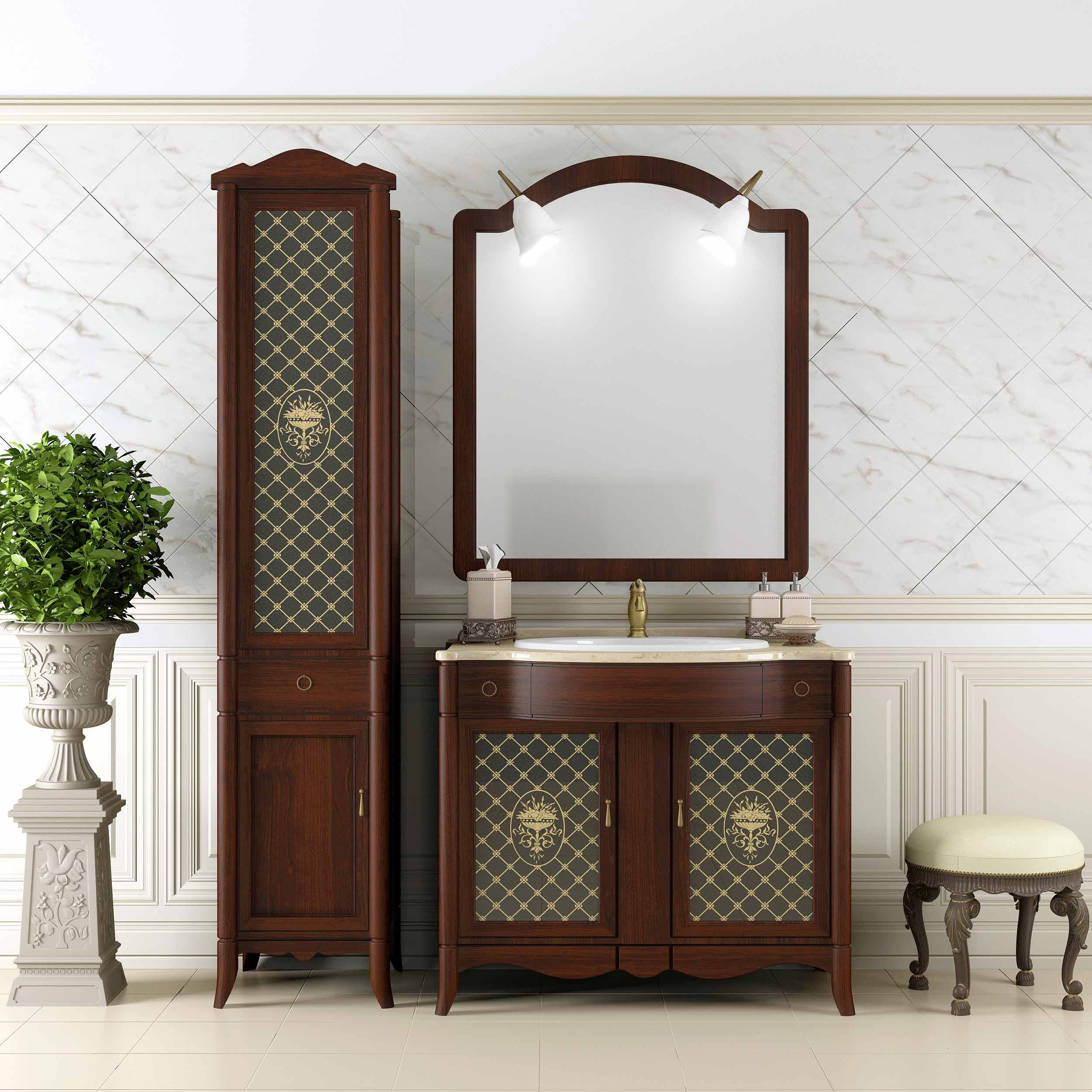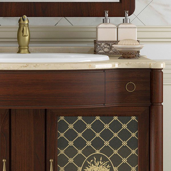 Коллекция Виктория выполнена в лучших традициях классического итальянского дизайна и из высококачественного массива бука, с применением современных технологий патинирования. Коллекцию Виктория особенно выделяет гнутая верхняя часть фасада и изумительные стеклянные витражи с уникальной гравировкой. Мраморная столешница, шикарная бронзовая фурнитура и накладная керамическая раковина дополняют и завершают уникальный дизайн коллекции Виктория. Коллекция Виктория представлена в уникальном размере 90 см. В коллекции Виктория дополнительно можно заказать изящный напольный пенал на ножках.Характеристики
