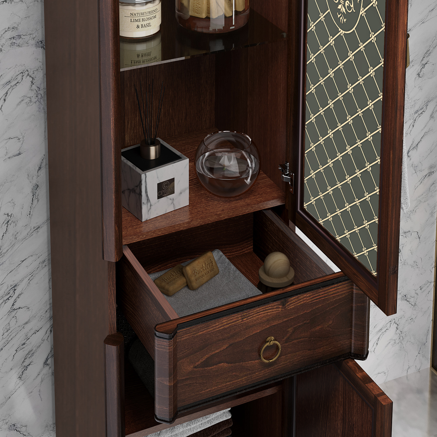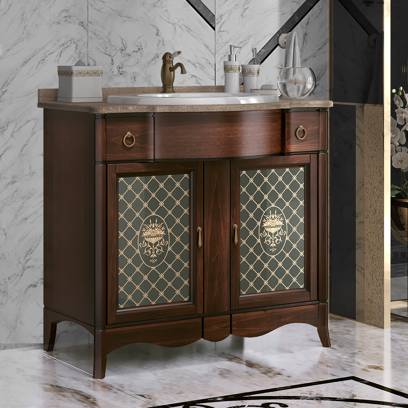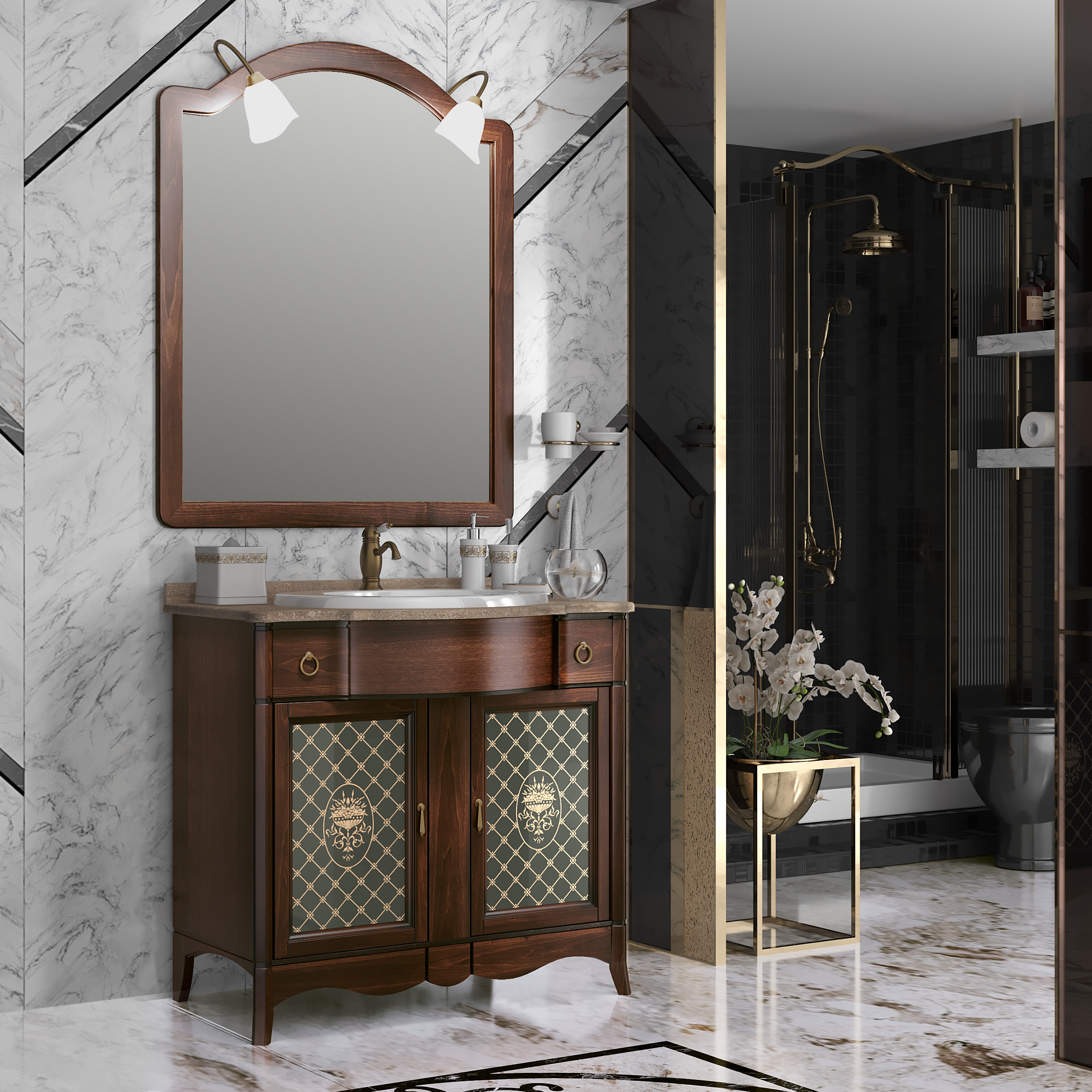 Коллекция Виктория выполнена в лучших традициях классического итальянского дизайна и из высококачественного массива бука, с применением современных технологий патинирования. Коллекцию Виктория особенно выделяет гнутая верхняя часть фасада и изумительные стеклянные витражи с уникальной гравировкой. Мраморная столешница, шикарная бронзовая фурнитура и накладная керамическая раковина дополняют и завершают уникальный дизайн коллекции Виктория. Коллекция Виктория представлена в уникальном размере 90 см. В коллекции Виктория дополнительно можно заказать изящный напольный пенал на ножках.Характеристики