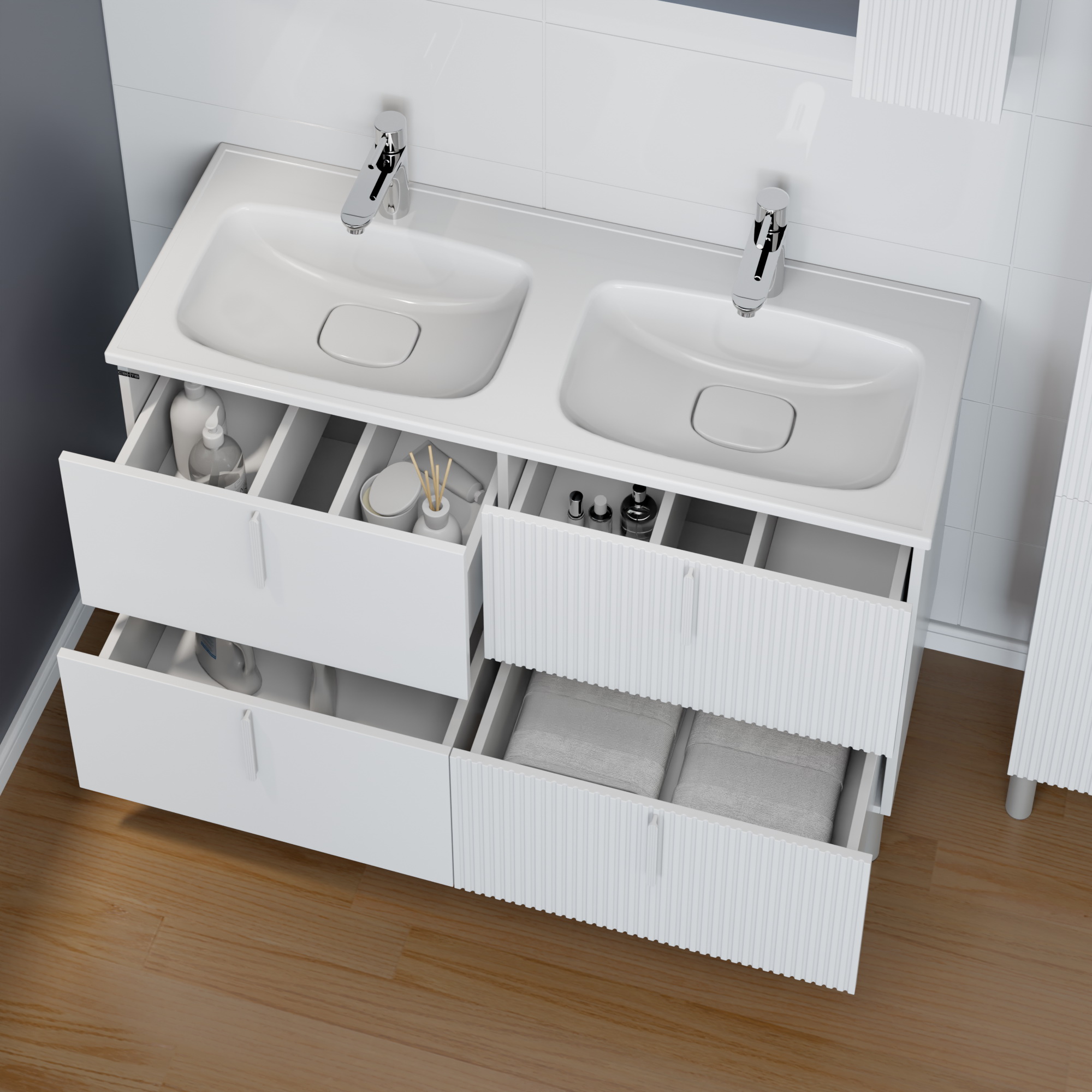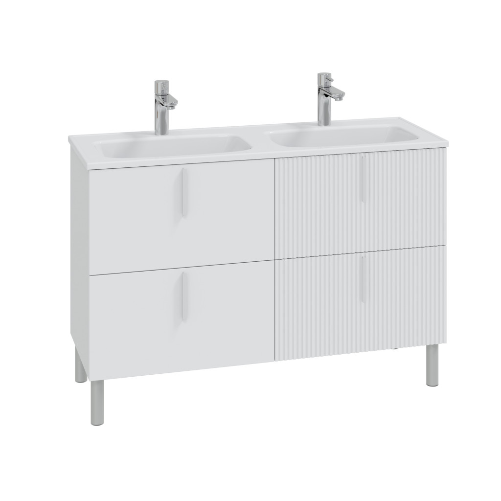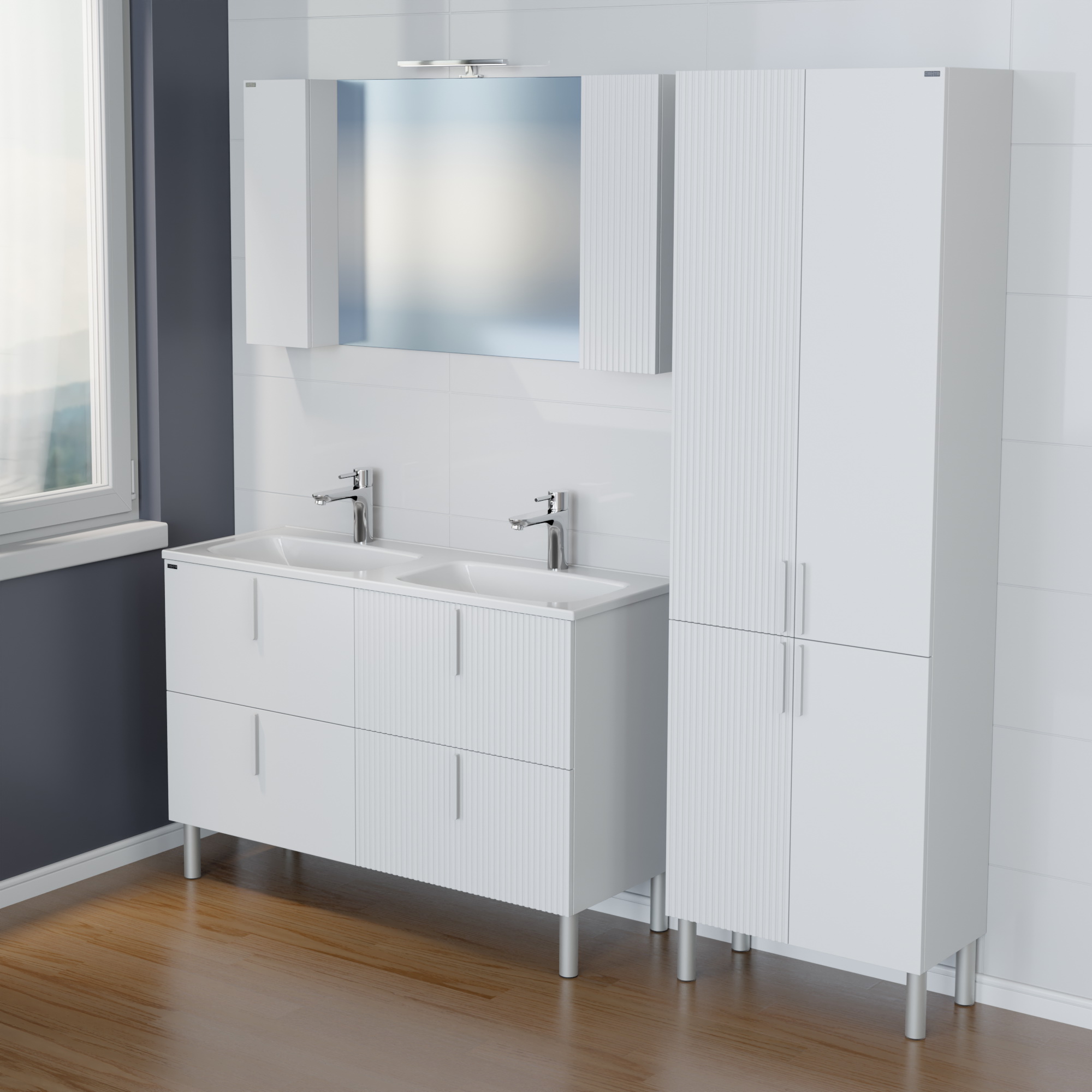 Тумба Санта Вега 120 — это современное решение для вашей ванной комнаты. Фасады и боковины выполнены из МДФ и покрыты глянцевой эмалью, ящики оборудованы доводчиками нижнего монтажа. Ящики отличаются стильным дизайном - два ящика имеют гладкий глянцевый фасад, а два выполнены с вертикальной реечной фрезеровкой. В комплекте с тумбой идут четыре стильные ручки и пять высоких ножек, которые обеспечивают надёжность и устойчивость всей конструкции. К тумбе Вега 120 подходит умывальник Санта Венера 120 с двойной чашей, выполненный из литьевого мрамора. Тумба под умывальник Вега 120 — это изысканное и практичное решение для вашей ванной комнаты. Она не только украсит интерьер, но и обеспечит все необходимое для хранения. Мебель из комплекта можно покрасить в любой цвет по каталогу RAL Classic под заказ.