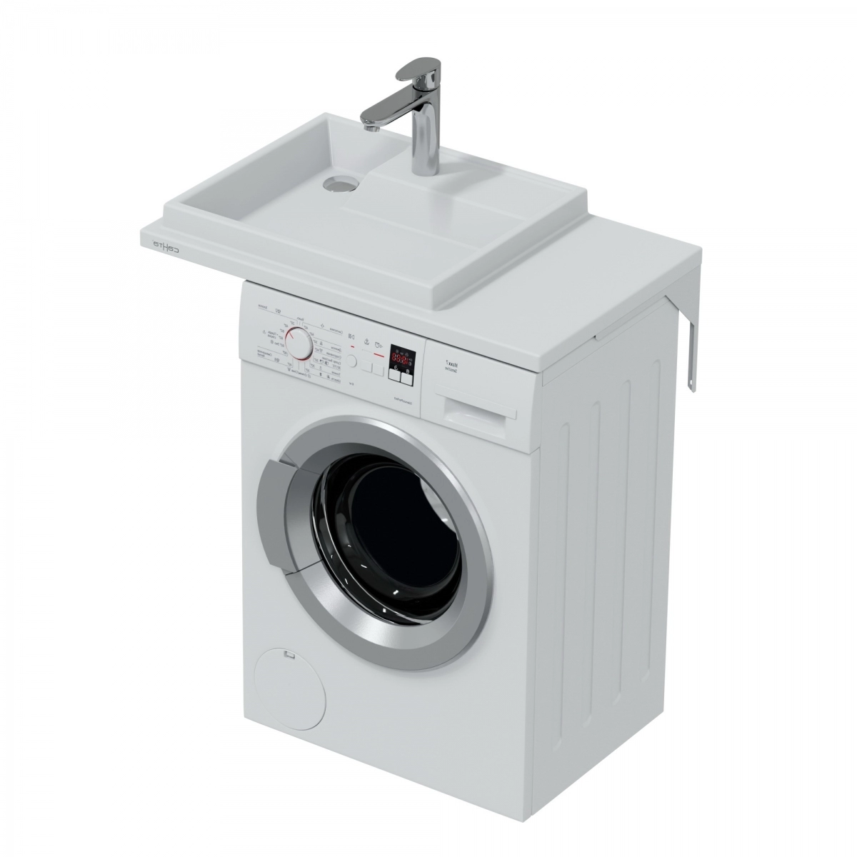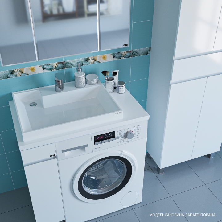 Максимально возможная глубина стиральной машины 50 см. Раковина над стиральной машиной СанТа Юпитер 80х50 выполнена в современном стиле, монолитная раковина из литьевого мрамора в виде прямоугольной чаши, встроенной в столешницу. Такая форма умывальника позволяет помимо прямого назначения использовать еще и столешницу для размещения различных ванных принадлежностей. Покрытие раковины гелькоутом премиум качества для судостроения и изделий с повышенными требованиями (производитель Ashland), который отличается повышенной прочностью, а по уровню водопоглощения выигрывает у привычных санфаянса и фарфора, что позволяет дольше сохранять первоначальную белизну и глянец. Изделие устанавливается на кронштейны над стиральной машинкой, возможно использование совместно с тумбой (кронштейны и тумба приобретаются отдельно).
