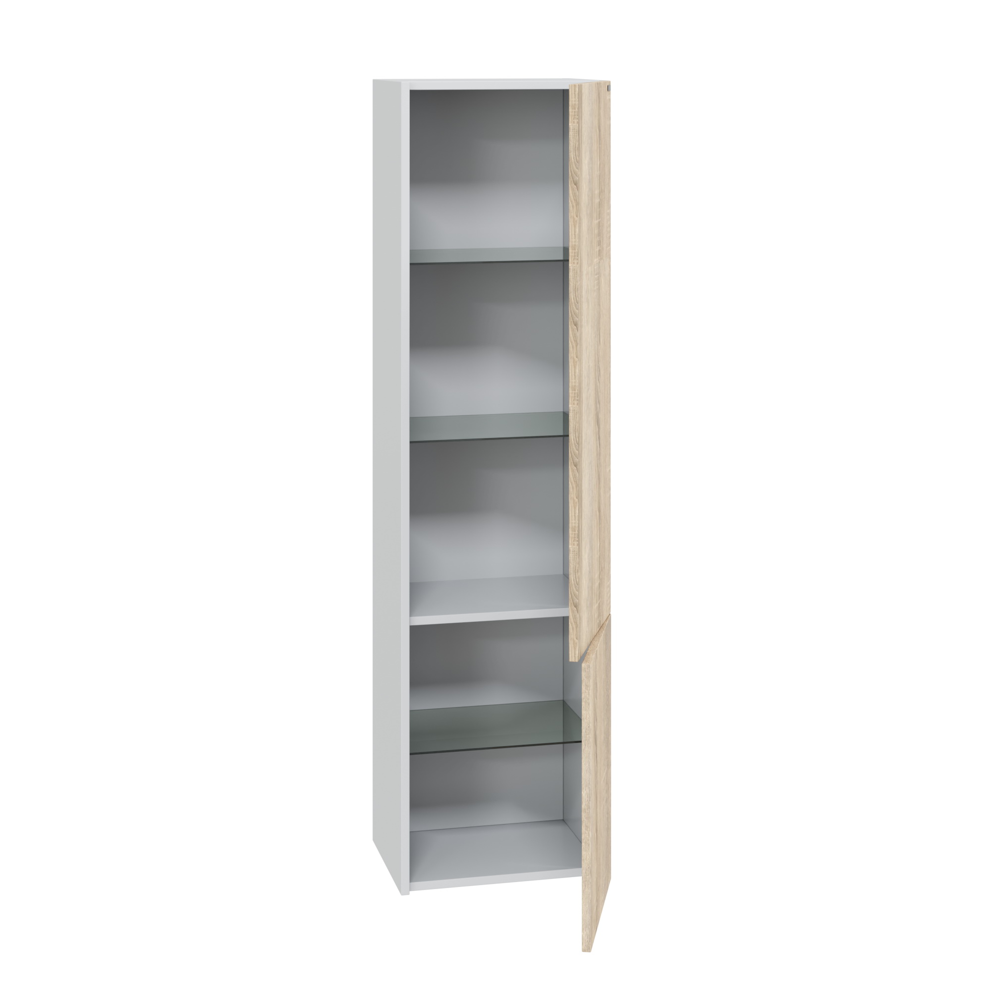 Шкаф-пенал подвесной Меркурий 40. Фасады пенала выполнены из ЛДСП с ламинацией, боковины покрыты матовой белой эмалью. На дверках петли с плавным закрыванием, полочки выполнены из стекла.