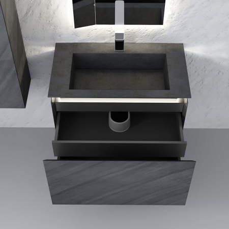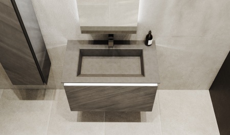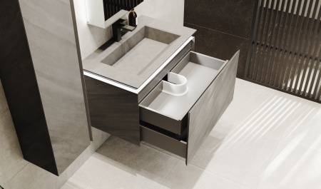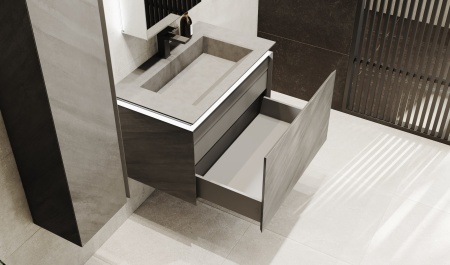 Корпус и фасад выполнены из МДФ, покрытым пластиком HPL цвета "бетон". Тумба оснащена полочкой и выдвижным ящиком с интегрированной ручкой в верхней части фасада ящика. Комплекты оснащены бетонными раковинами (раковина приобретается отдельно). В тумбу встроена подсветка раковин.