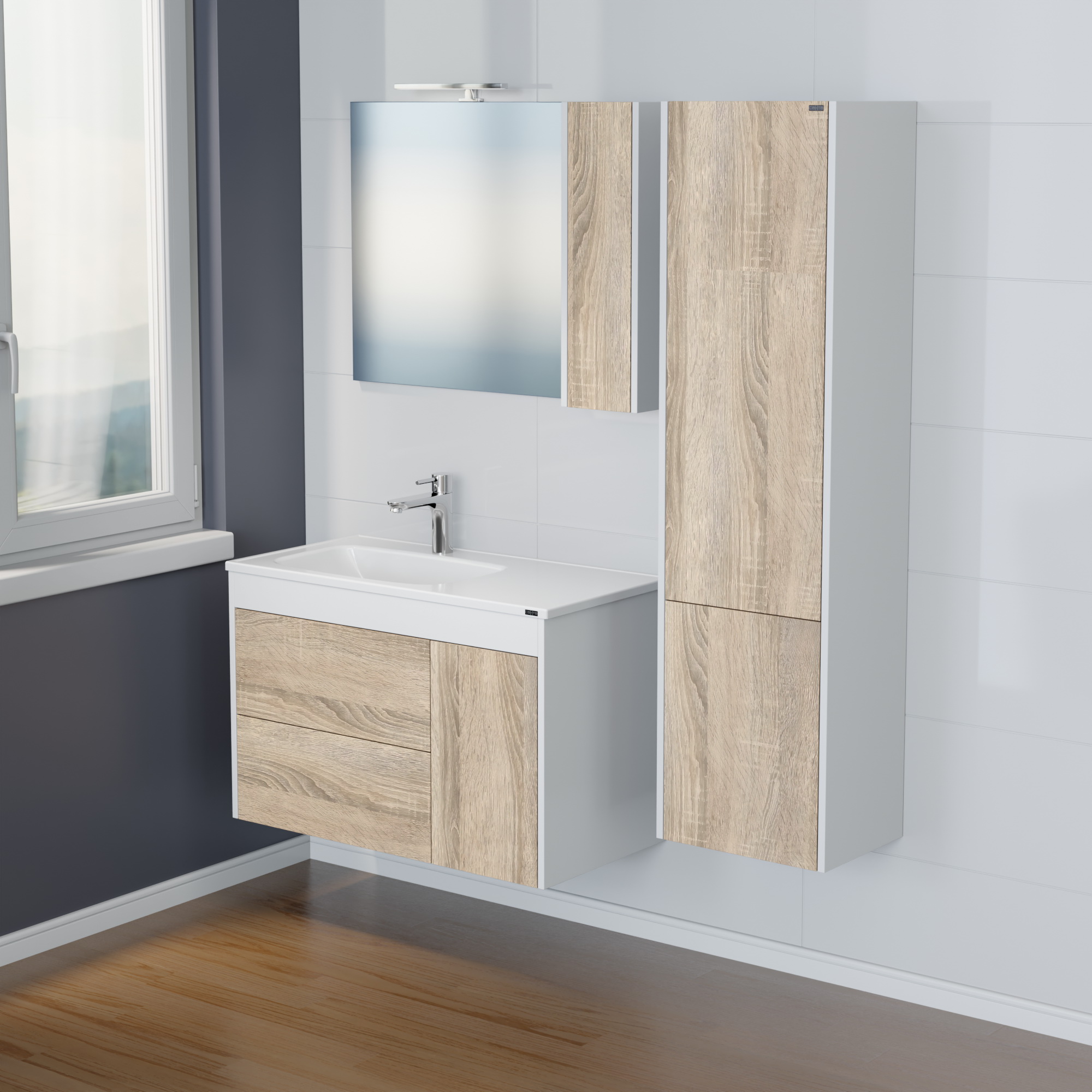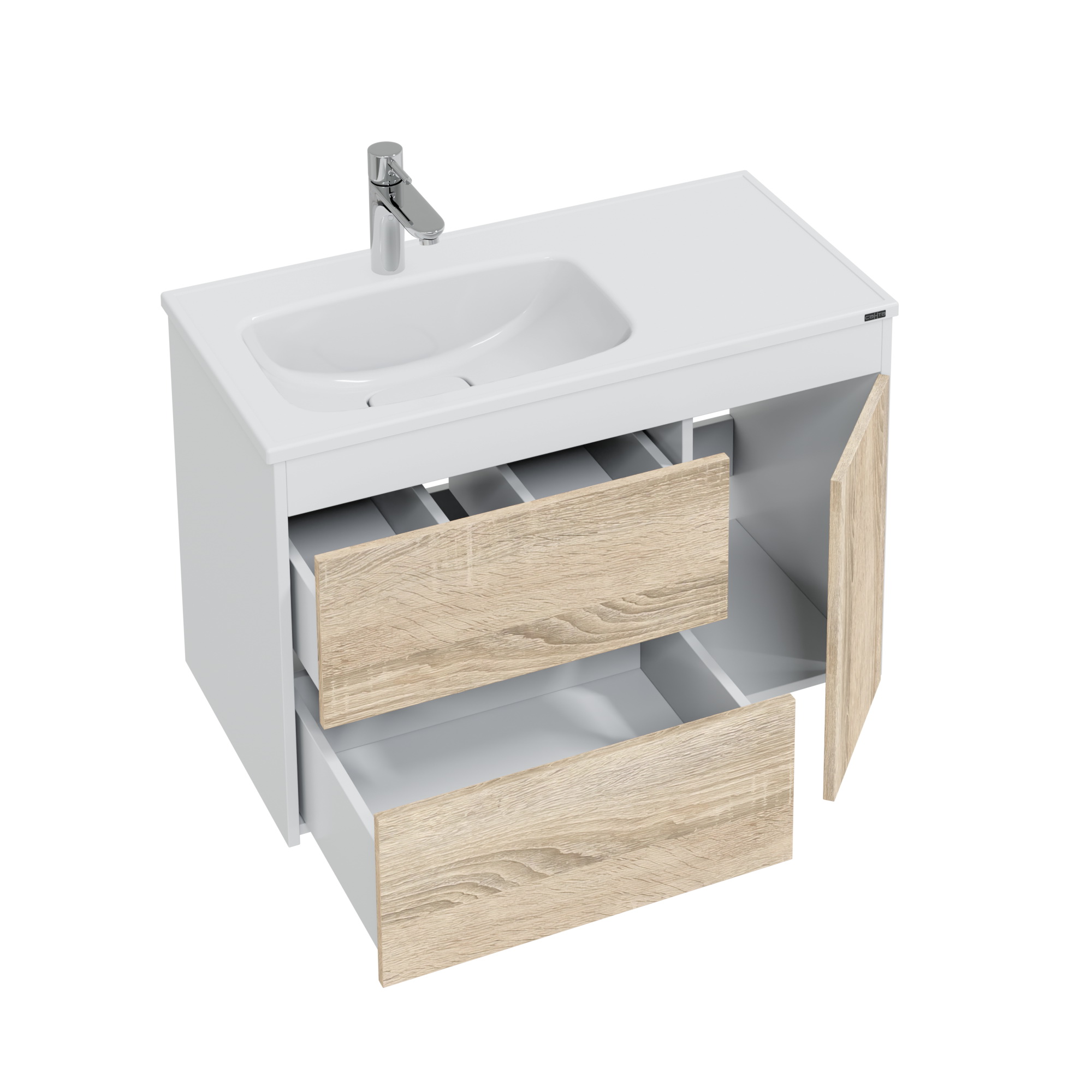 Подвесная тумба Меркурий 90 под умывальник Венера 90. Фасады тумбы выполнены из ЛДСП с ламинацией, боковины и верхняя планка покрыты матовой белой эмалью. Выдвижные ящики и дверь открываются с помощью механизма "Push to open" (нажать, что бы открыть), на дверке петли с плавным закрыванием.