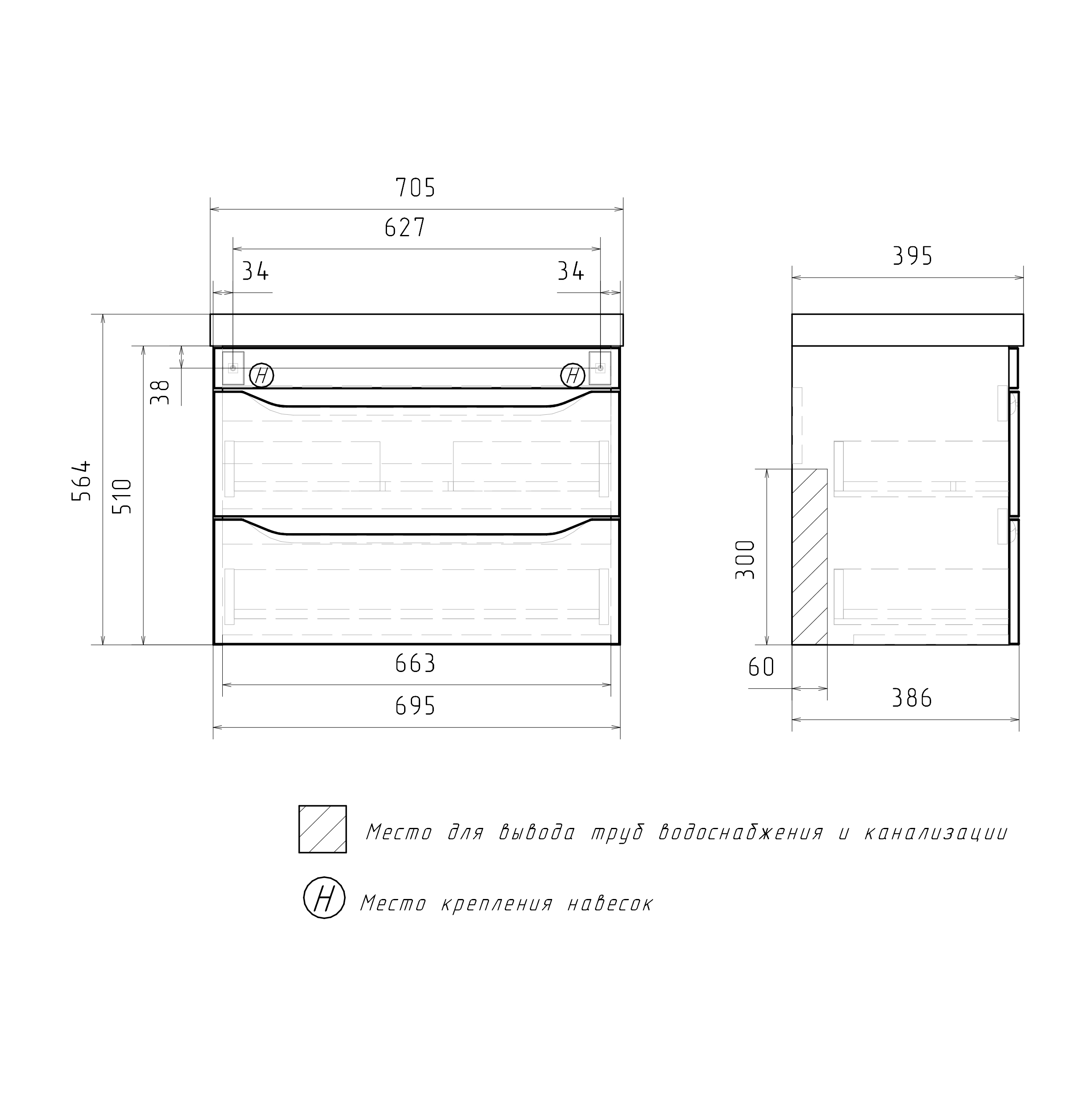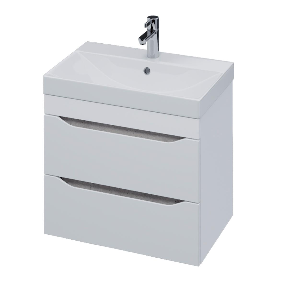 Подвесная тумба с двумя выдвижными ящиками с системой плавного закрывания. Фасады тумбы изготовлены из МДФ и облицованы глянцевой пленкой ПВХ. Ящики открываются при помощи интегрированных ручек. Интегрированные ручки, фурнитура с системой плавного закрывания. Декоративный элемент в цвете серый бетон.