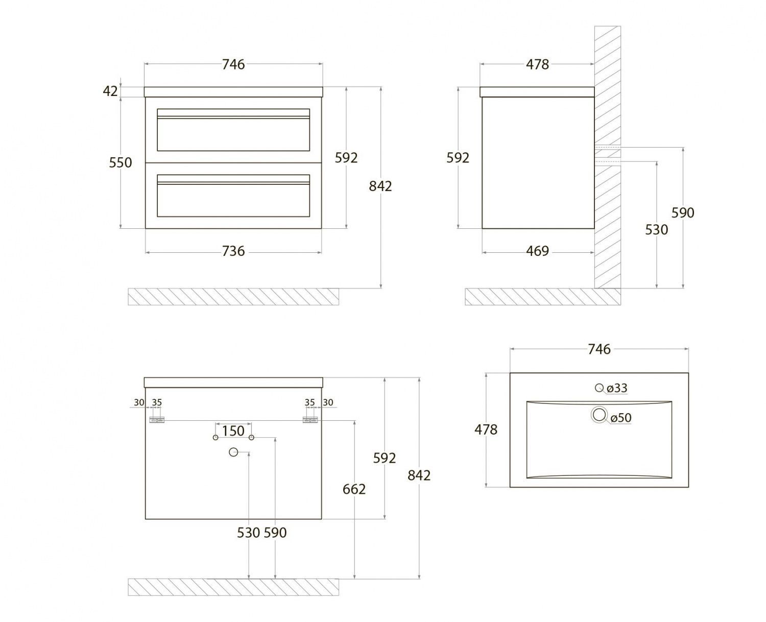 Комплект подвесной мебели для ванной комнаты с раковиной из искусственного камня. Раковина сифоном не комплектуется. Система хранения состоит из 2 выдвижных ящиков. Тумба Platino 75 светло серая оснащена доводчиками скрытого монтажа с системой Soft close (плавного закрывания)