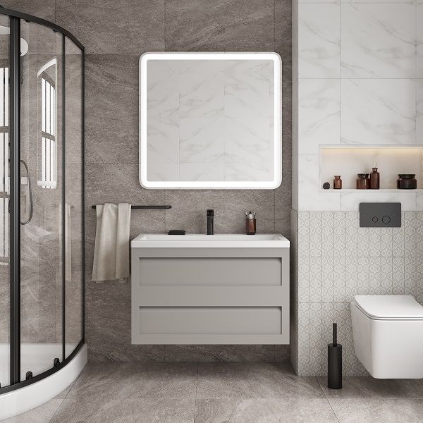 Комплект мебели Art&Max Platino 90 Светло серый с раковиной из искусственного камня. Раковина сифоном не комплектуется. Система хранения состоит из 2 выдвижных ящиков. Тумба Platino 75 светло серая оснащена доводчиками скрытого монтажа с системой Soft close (плавного закрывания)
