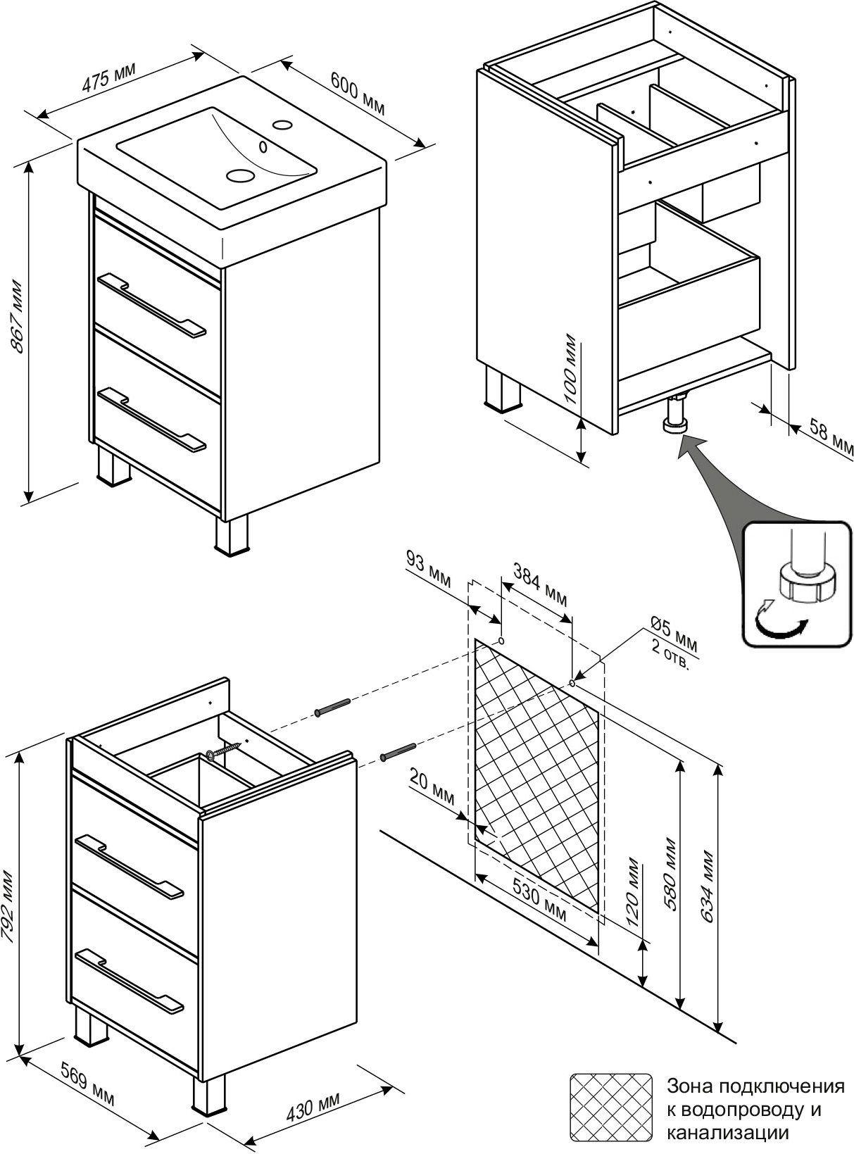 Функциональность:- Раковина в комплекте выполнена из материала фаянс, имеет прямоугольную форму.