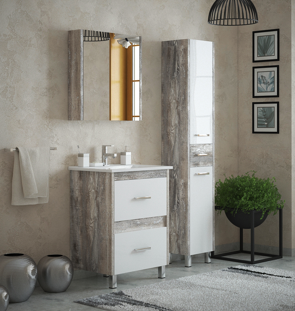 У тумбы 2 выдвижных ящика. Высота ящиков 170 мм, верхний ящик разделен пополам. Тумба стоит на 4 металлических опорах. Боковины выполнены из ЛДСП 26 мм толщиной.