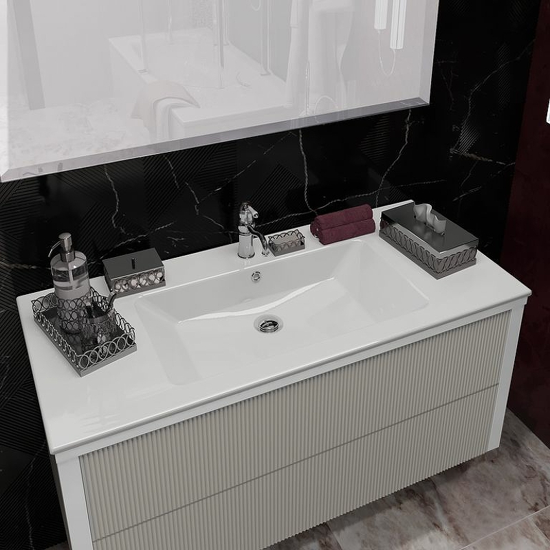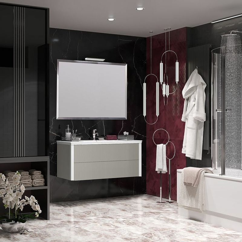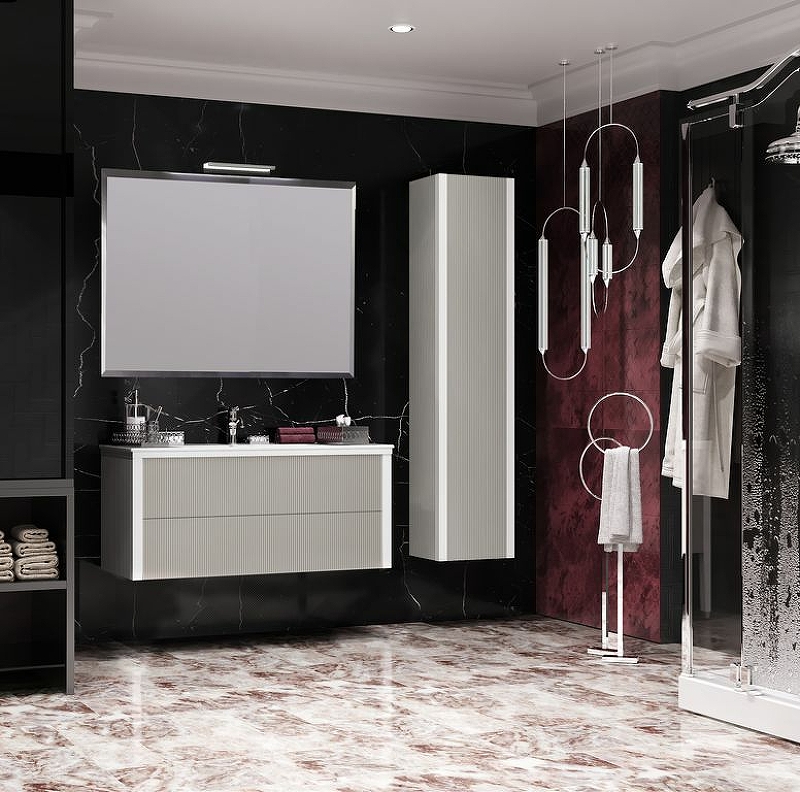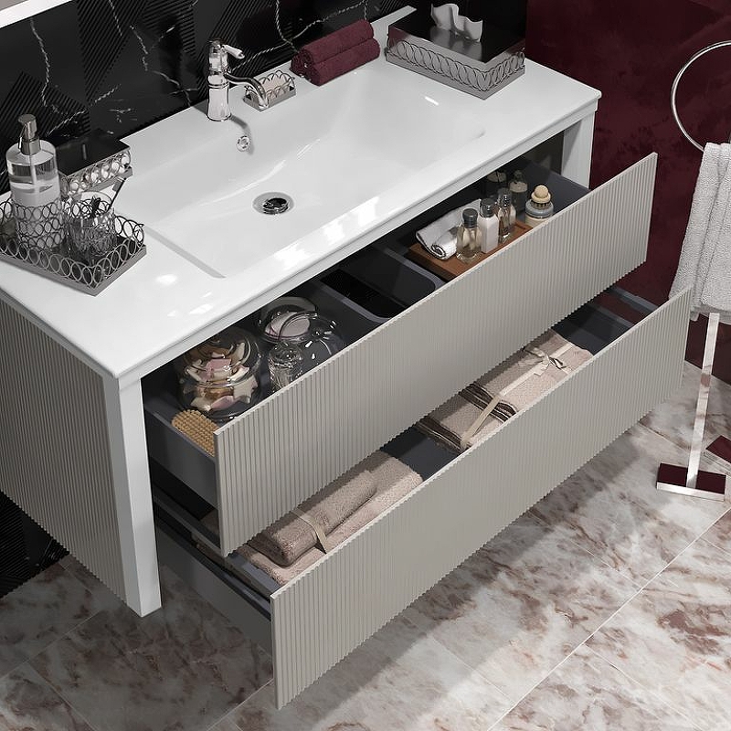 Коллекция Opadiris Рубинно исполнена по всем современным требованиям стиля для мебели в ванную комнату. Рельефные фасады тумбы с технологией открывания push-to-open покрыты влагостойкой эмалью. Коллекция Рубинно включает в себя подвесные и напольные тумбы 90 и 120 размера, в двух исполнениях. В напольном исполнении тумба Рубинно имеет ножки, сделанные из массива бука, что придает этой коллекции особую изысканность. Рельефные фасады тумбы с технологией открывания push-to-open покрыты влагостойкой эмалью серого цвета и белого цвета.