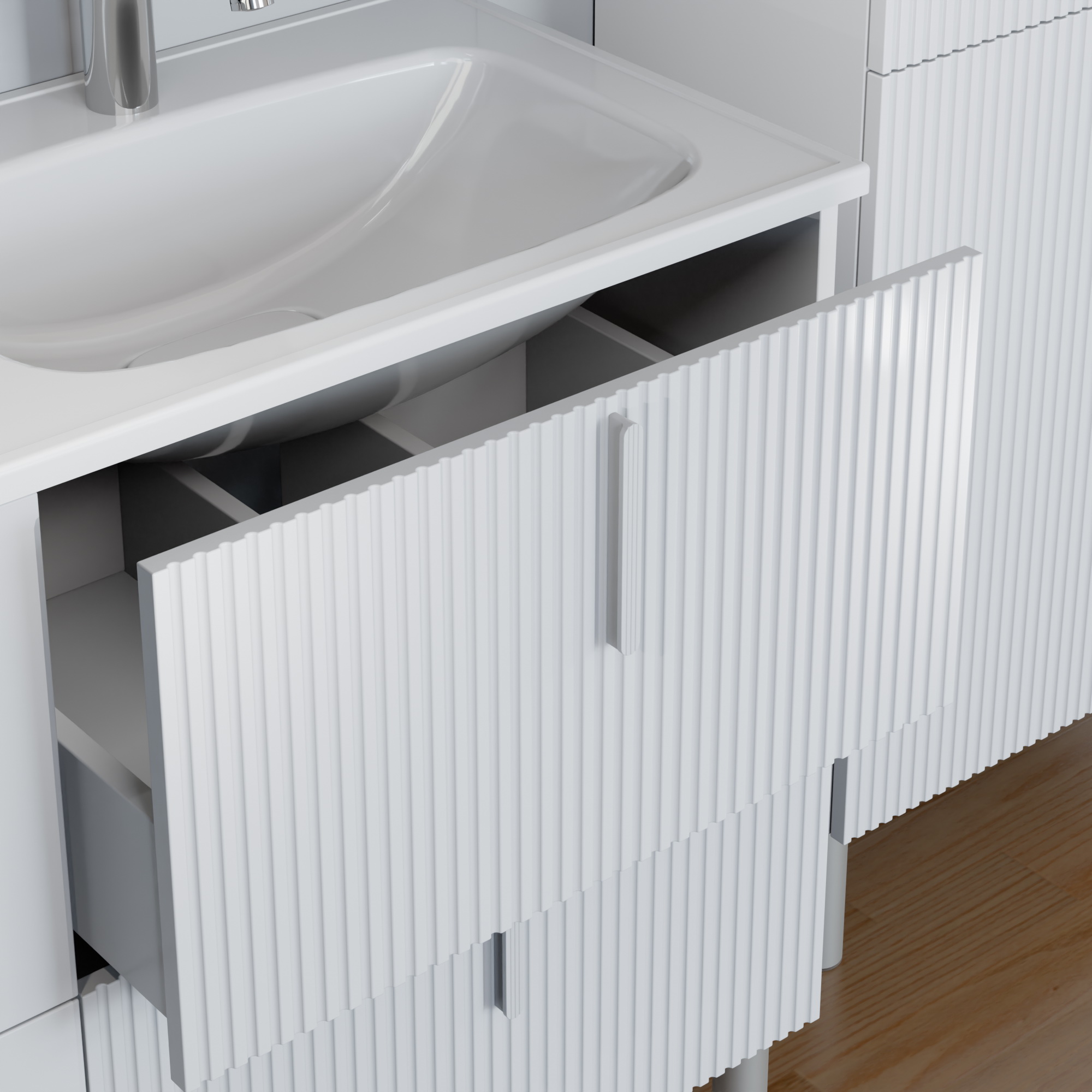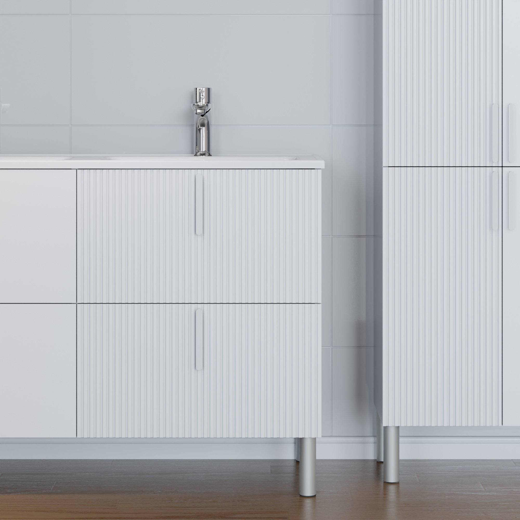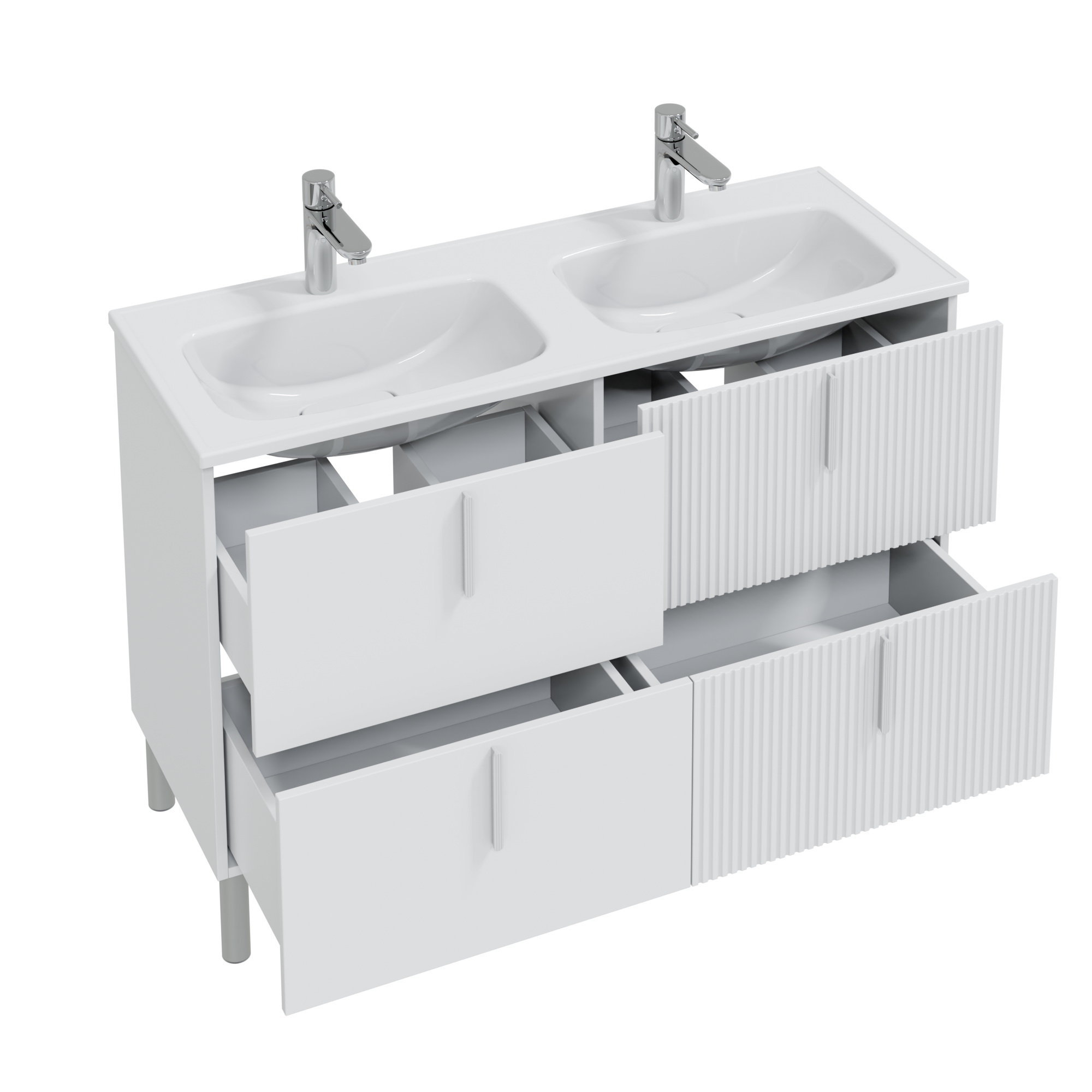 Тумба Санта Вега 120 — это современное решение для вашей ванной комнаты. Фасады и боковины выполнены из МДФ и покрыты глянцевой эмалью, ящики оборудованы доводчиками нижнего монтажа. Ящики отличаются стильным дизайном - два ящика имеют гладкий глянцевый фасад, а два выполнены с вертикальной реечной фрезеровкой. В комплекте с тумбой идут четыре стильные ручки и пять высоких ножек, которые обеспечивают надёжность и устойчивость всей конструкции. К тумбе Вега 120 подходит умывальник Санта Венера 120 с двойной чашей, выполненный из литьевого мрамора. Тумба под умывальник Вега 120 — это изысканное и практичное решение для вашей ванной комнаты. Она не только украсит интерьер, но и обеспечит все необходимое для хранения. Мебель из комплекта можно покрасить в любой цвет по каталогу RAL Classic под заказ.