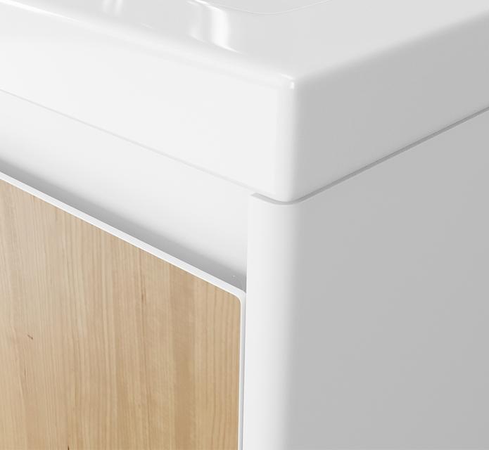 Направляющие полного выдвижения Hettich с системой плавного закрывания позволяют максимально использовать отведенный объем и обеспечивают плавное, бесшумное закрытие ящика. Интегрированная ручка фасада. Отсутствие лицевой фурнитуры сохраняет утонченный дизайн коллекции и гарантирует безопасность использования, благодаря ровной поверхности фасадов тумб. Фасад облицован HPL-пластиком - экологичный композитный материал на основе древесины устойчив к загрязнениям, прост в уходе и долговечен. Боковины изделия изготовлены из МДФ, покрытого плёнкой ПВХ - для обеспечения максимальной защиты от воды и механических повреждений. Встроенный органайзер. Мы задействовали самое неиспользуемое место для хранения косметических средств и принадлежностей. Поддон-органайзер для мелочей не занимает пространство ящика. А, главное, всё необходимое всегда находится под рукой.