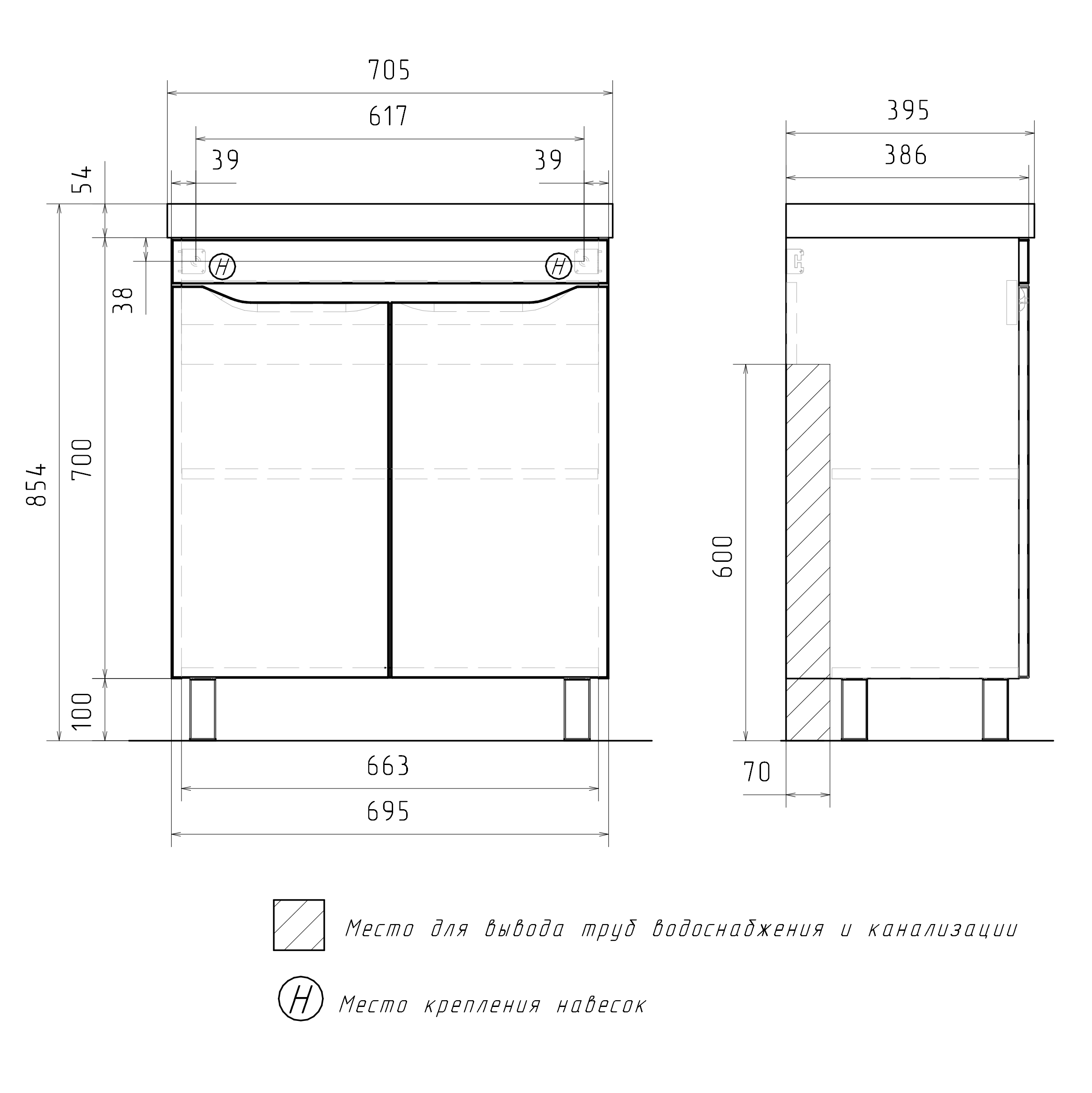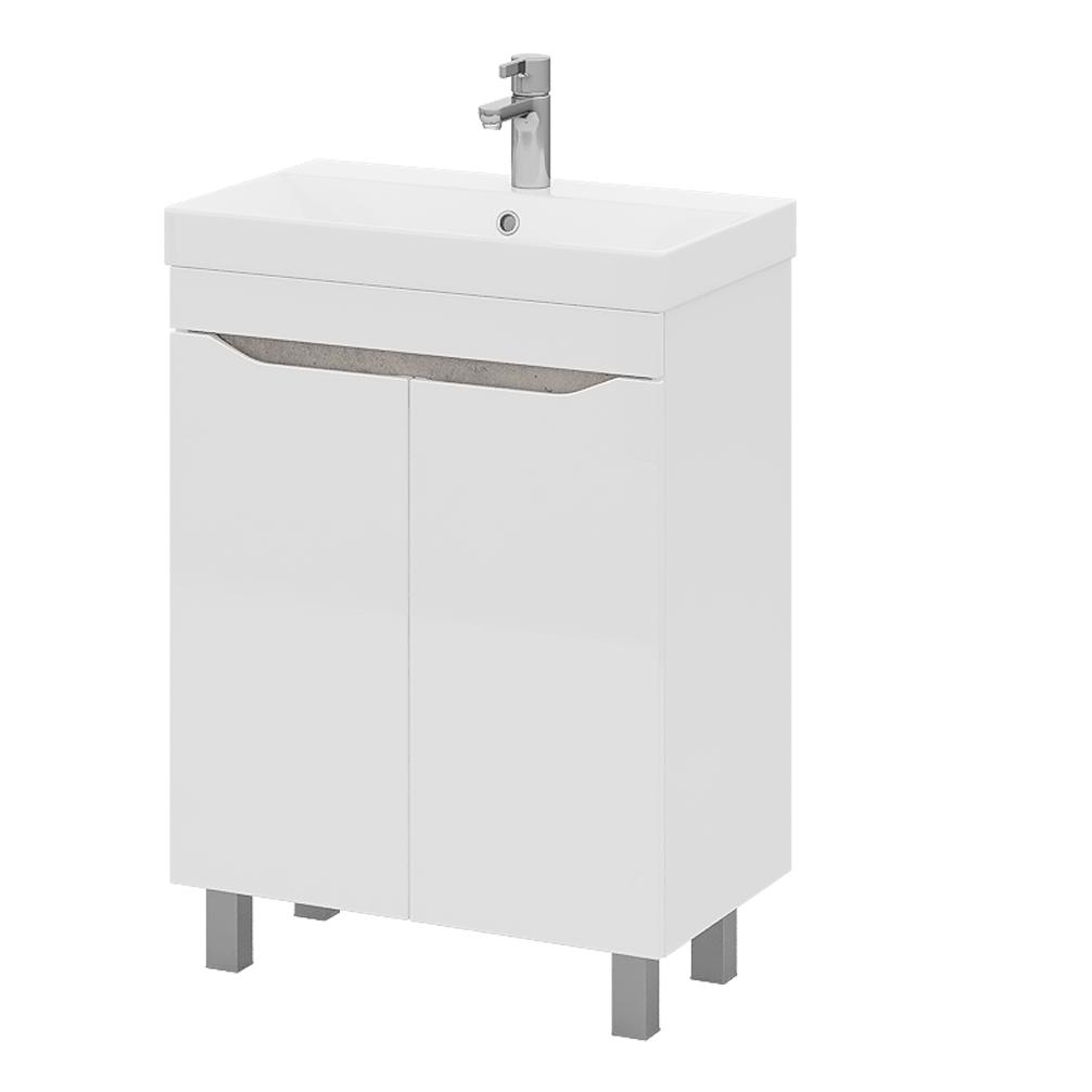 Напольная тумба с двумя распашными дверцами. Внутри полка из ЛДСП. Петли на дверцах оснащены доводчиками. Дверцы тумбы изготовлены из МДФ, облицованы глянцевой пленкой ПВХ. Дверцы открываются при помощи интегрированных ручек. Тумба устанавливается на четыре регулируемые опоры и фиксируется к стене при помощи креплений. Интегрированные ручки, фурнитура с системой плавного закрывания. Декоративный элемент в цвете серый бетон.